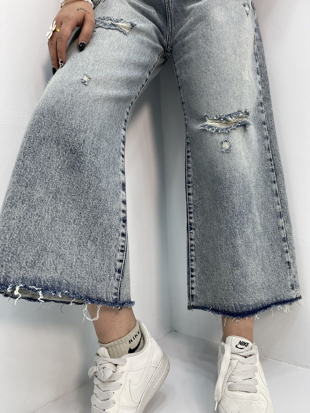 شلوار جین زنانه واید لگ با طراحی خاص خود در قسمت ران و باسن تنگ تر و به تدریج از قسمت بالا زانو به پایین گشاد می شوند و تنخور بسیار شیک و خاصی به استایل شما می دهند. زاپ‌ هایی که با دقت و ظرافت در بخش ران و زانو کار شده‌ اند، حالتی متفاوت و جذاب به این مدل شلوار داده اند که این طراحی برای کسانی که به ‌دنبال جین ‌هایی متفاوت و خاص هستند انتخاب خوبی است. قد ۹۰ سانتی‌ متری این شلوار، آن را برای استفاده با انواع کفش ‌ها، از کتانی تا کفش‌ های پاشنه ‌بلند، مناسب می‌ کند.